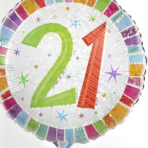 This eye-catching 21st birthday balloon is radiant with an array of metallic rainbow colours and silver sparkles – just right for getting into the party mood. The circular 45cm micro-foil balloon arrives filled with helium and tied to a weight with curling ribbon.