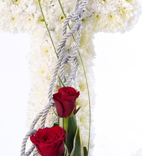 An anchor shaped design using a mass of white double spray chrysanthemums with a feature spray of red short Stem roses and a contrasting blue eryngium. The tribute is finished with green foliage and a silver cord.