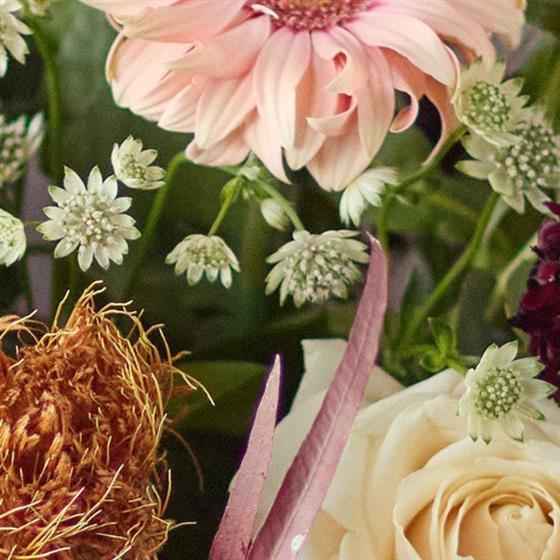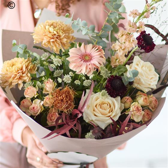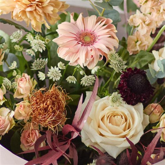 Our biggest autumn bouquet this one is a profusion of glorious texture and soft colour. Inspired by nature's muted majesty this time of year, it'll feature blooms in shades like russet, cream, apricot and chocolate.