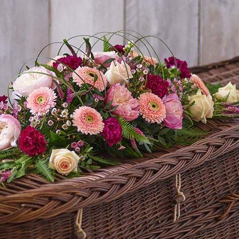 A beautiful spray of pastel blooms, including germini, roses, and carnations, arranged in a linear design.