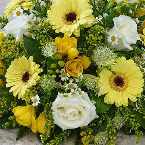A pretty combination of fresh yellow and white blooms featuring germini, astrantia and fragrant freesias.