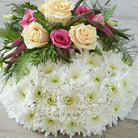 This posy features roses resting on a beautiful bed of white chrysanthemums.