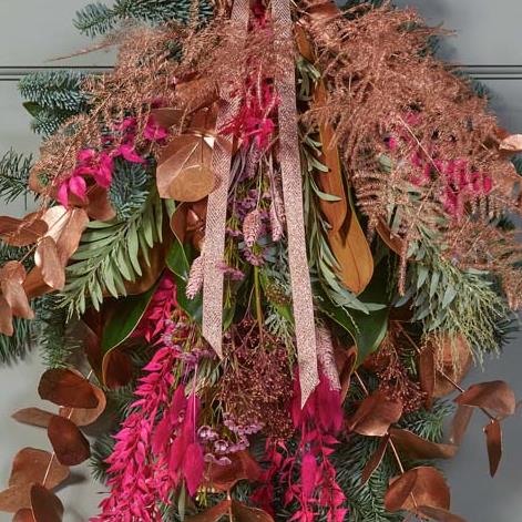 Known as a 'swag' (sort of like a flat bouquet meant for hanging on a door) this beautiful decoration will bring fresh festive style to the street. It'll feature fresh flowers and foliage. Expect cerise and purple tones, plus blooms in soft pink, peach or lilac shades. It might also feature dried flowers or foliage painted in copper or rose gold.